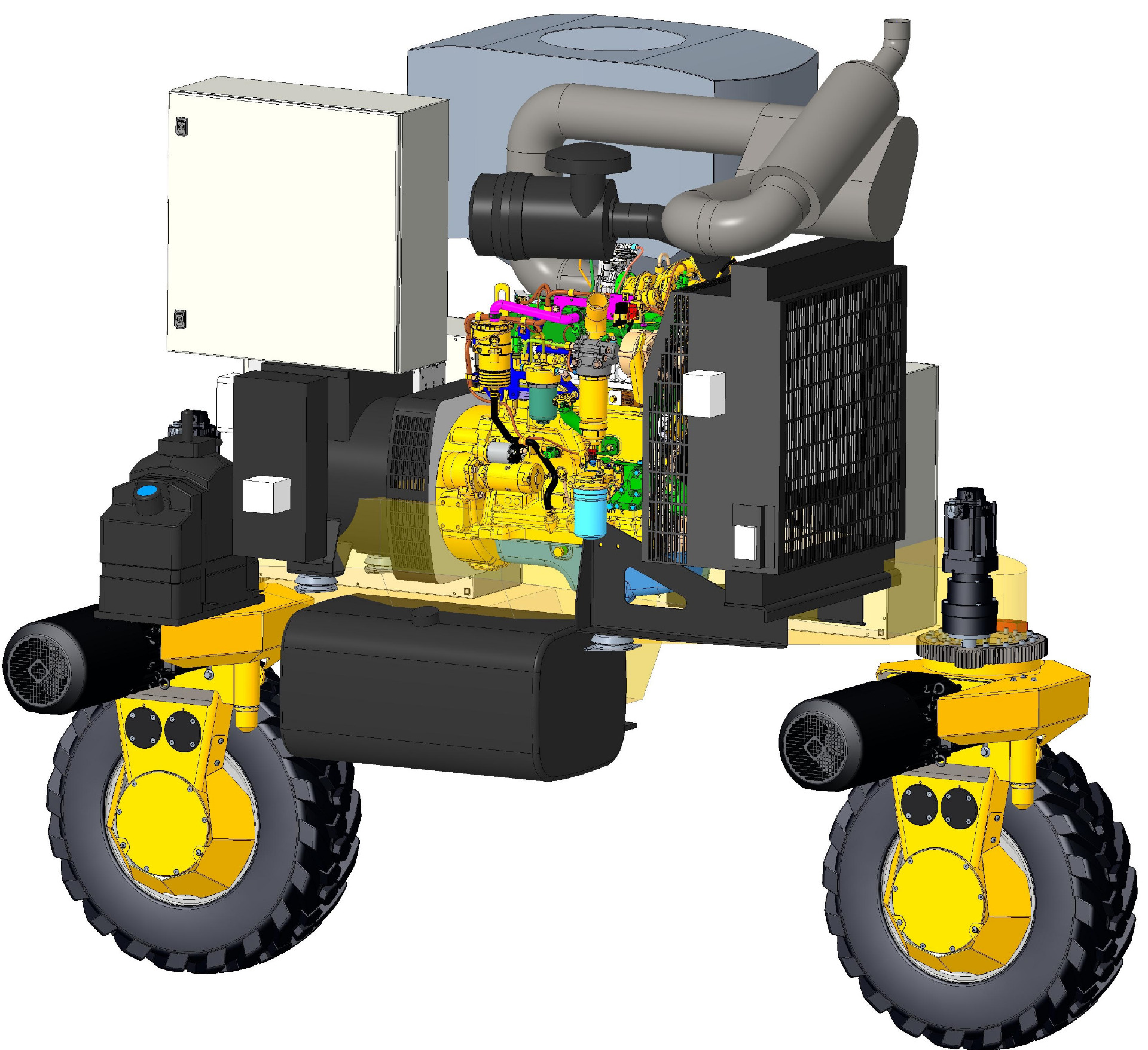 - Čtyřkolový podvozek s možností řízeného natáčení všech kol